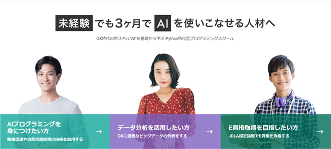 | .pro | Pythonのみ | 228,000円 (19,300円) | 6カ月 | なし | 就職・転職支援あり |